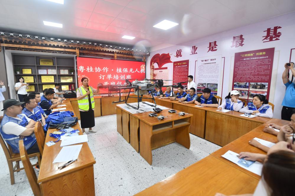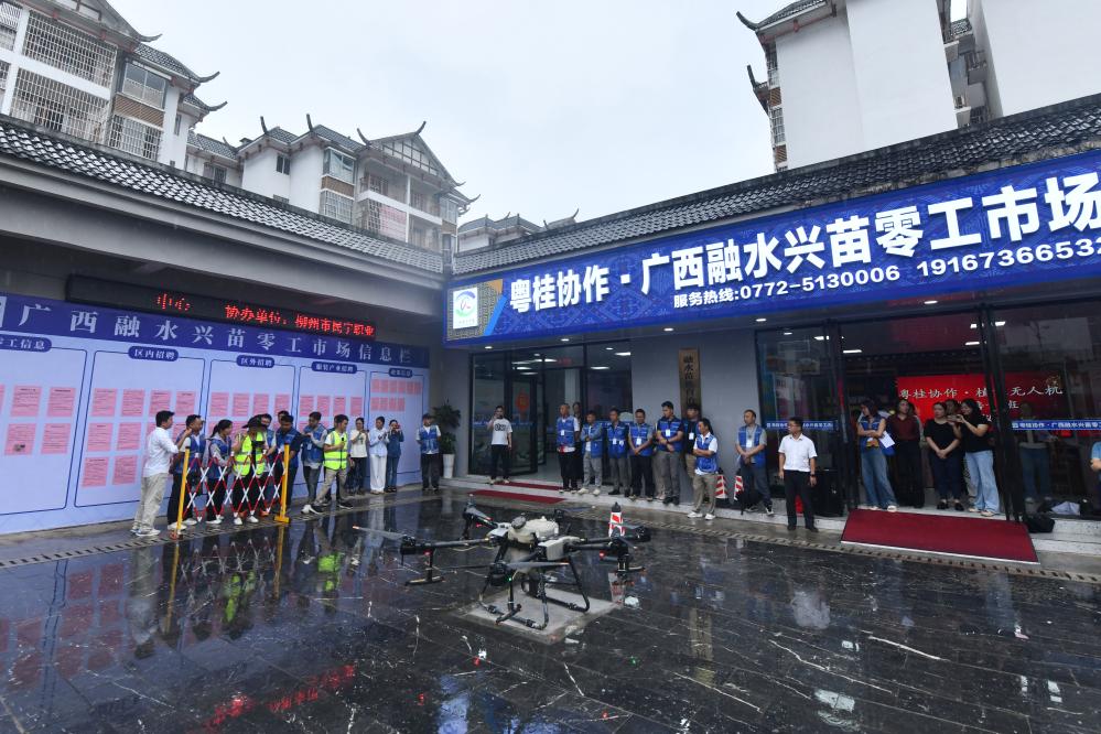 5月15日,在廣西融水苗族自治縣易地扶貧安置點苗美家園社區,群眾在零工市場進行植保無人機培訓。