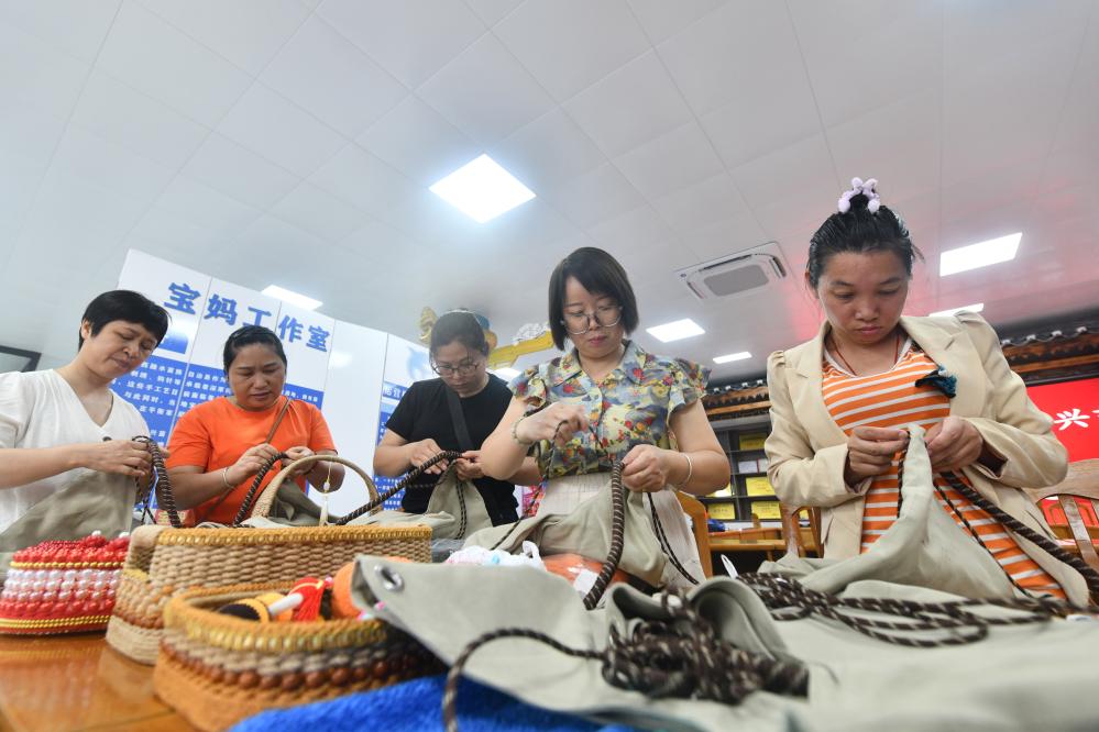 5月15日,在廣西融水苗族自治縣易地扶貧安置點苗美家園社區,群眾在零工市場制作手工藝品。