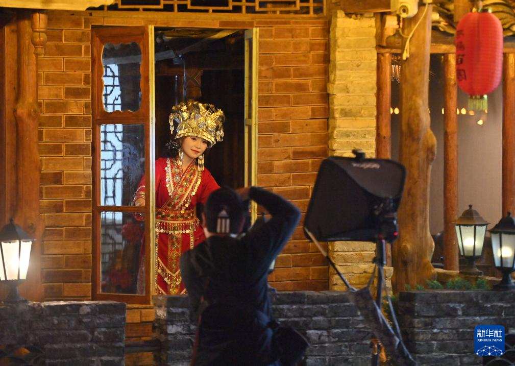 游客在融水苗族自治縣雙龍溝森林旅游度假區夢嗚苗寨拍照(4月15日攝)。