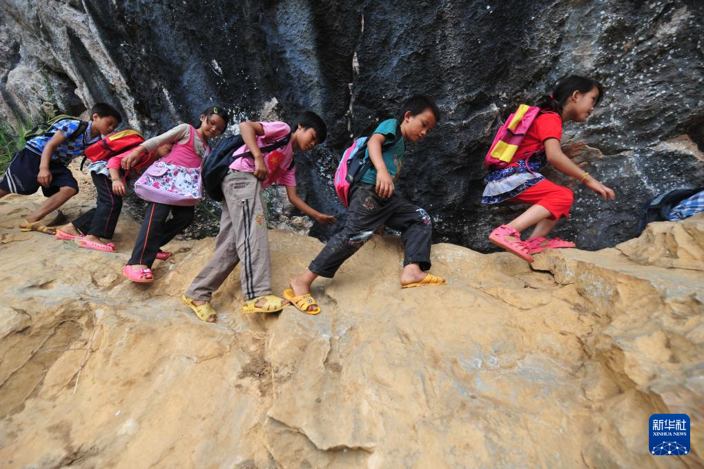 在廣西大化瑤族自治縣板升鄉弄雷村哈寶屯,10歲的蒙富松(左一)爬懸崖去學校讀書(2012年9月3日攝)。