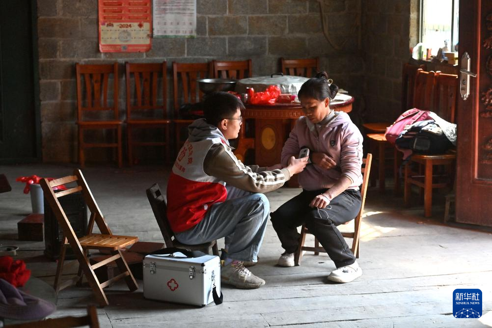 在廣西大化瑤族自治縣板升鄉弄雷村,村醫蒙富松進村入戶給村民看?。?025年1月19日攝)。