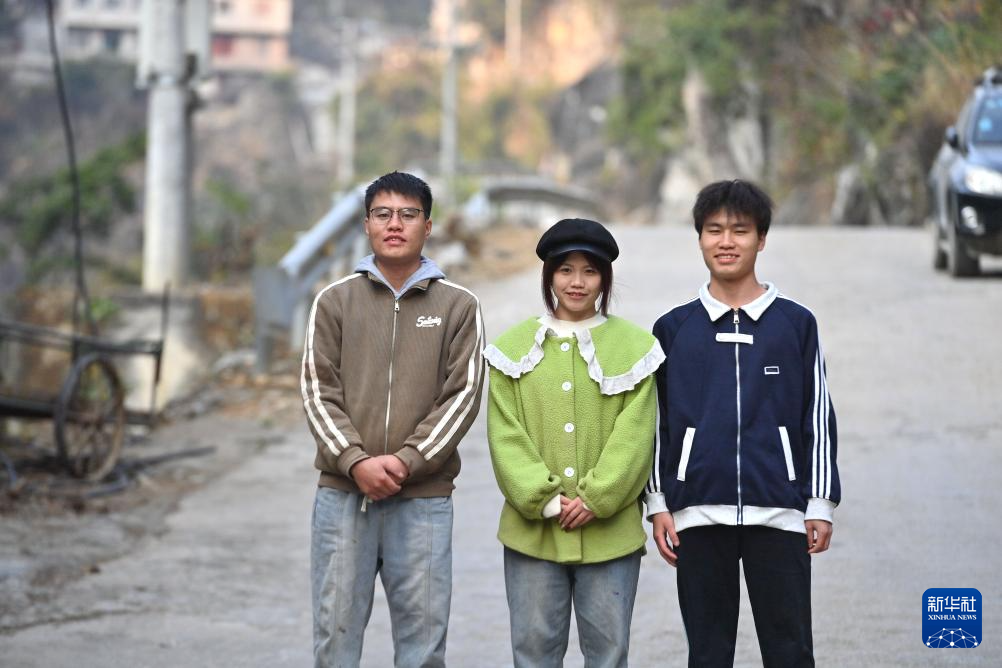在廣西大化瑤族自治縣板升鄉弄雷村,村醫蒙富松(左)和弟弟妹妹合影(2025年1月20日攝)。蒙富松的弟弟妹妹目前正在讀大學。