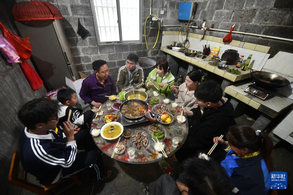 在廣西大化瑤族自治縣板升鄉弄雷村,村醫蒙富松(左四)和家人吃團圓飯(2025年1月20日攝)。