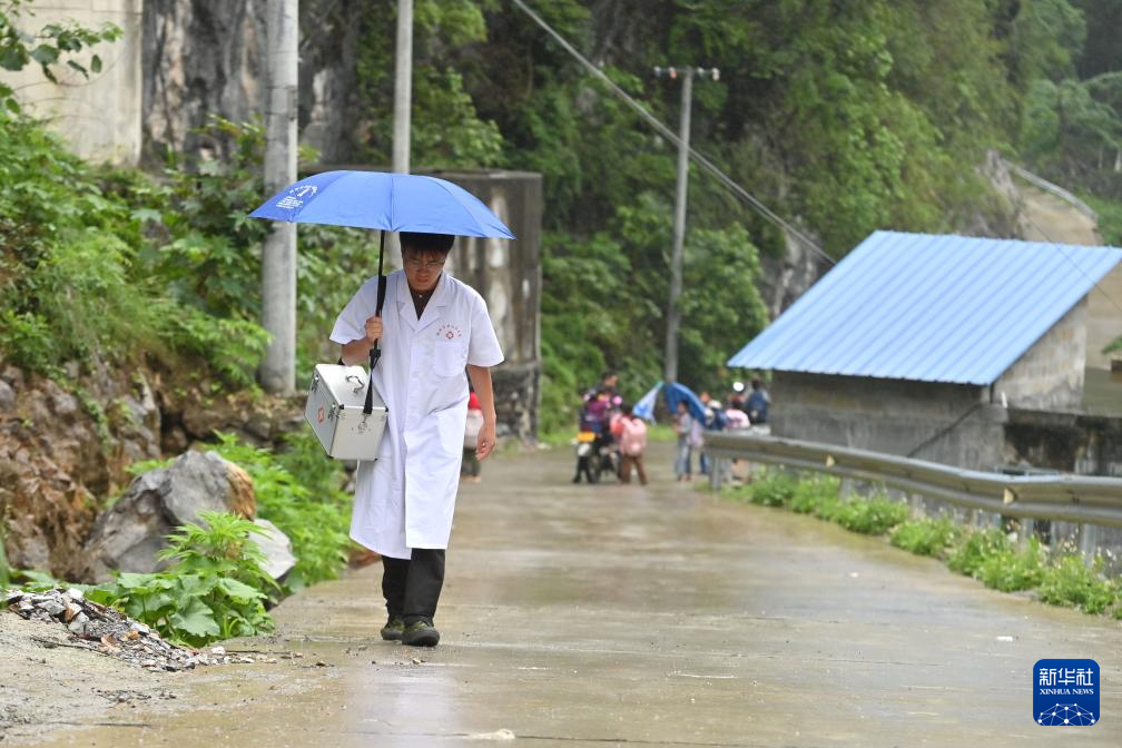 在廣西大化瑤族自治縣板升鄉弄雷村,村醫蒙富松走在村道上,準備進村入戶給村民看?。?025年5月27日攝)。