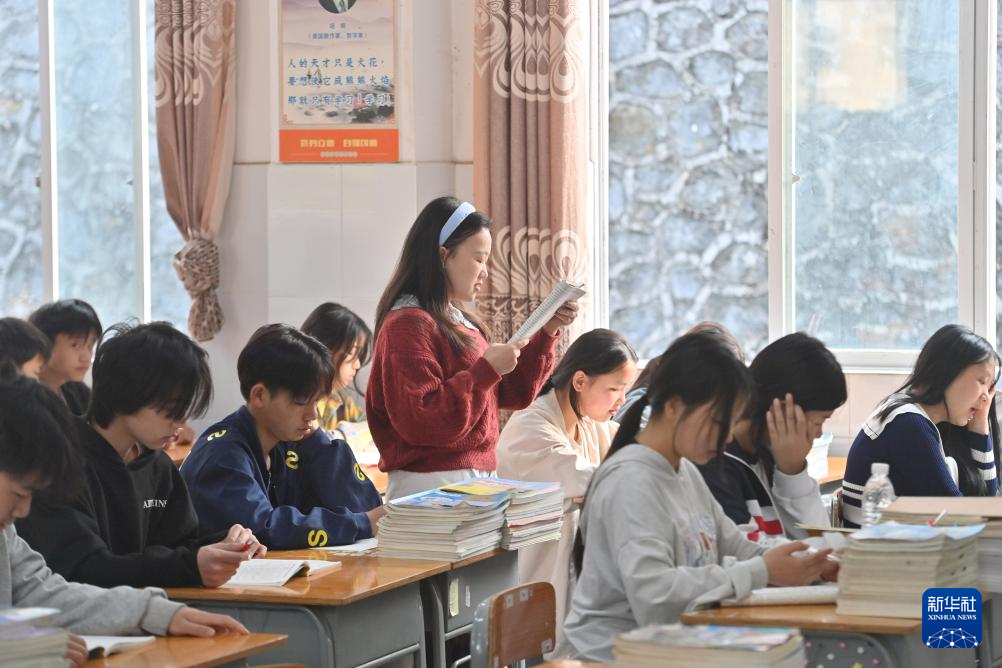 在廣西大化瑤族自治縣板升鄉初級中學,蒙秋艷給學生上課(2025年4月2日攝)。
