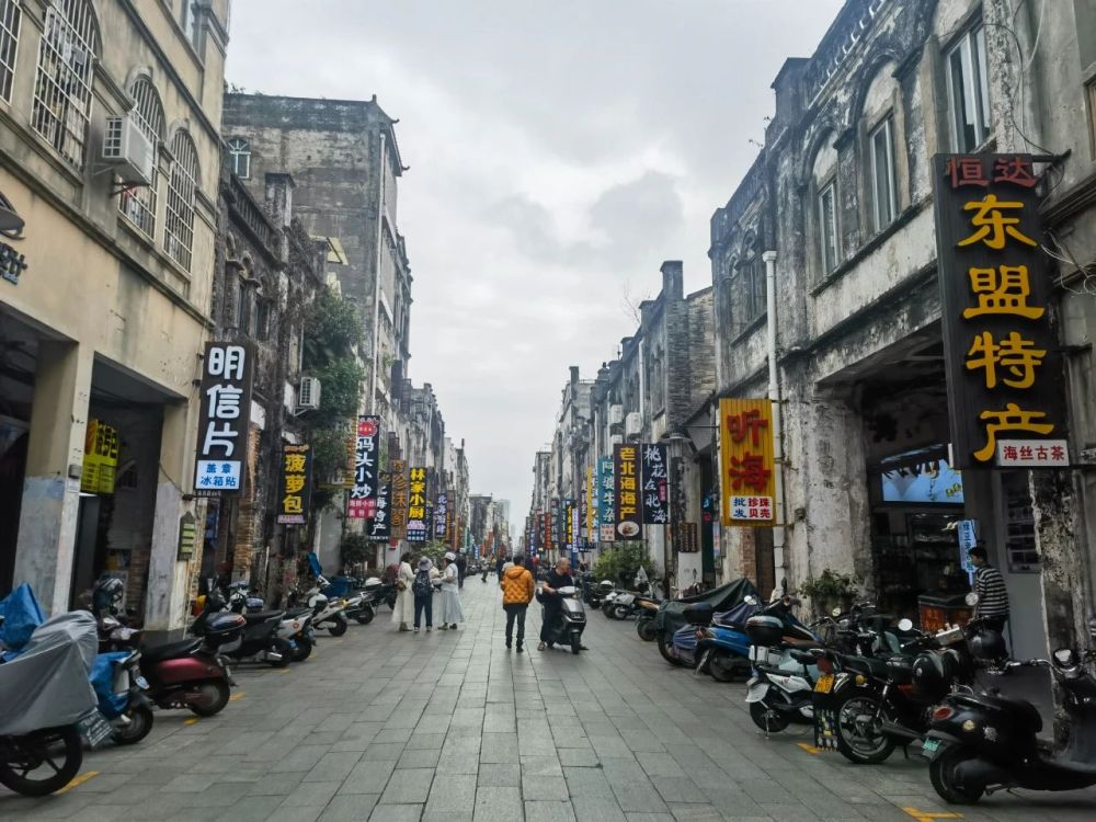漫步在老街,可以感受不一樣的市井風情,老人躺在搖椅上搖著蒲扇哼著疍家咸水歌,街坊鄰居聚在一起聊天、打牌,一條條通海巷陌里游人如織……商鋪斑駁的門楣上,依稀可見昔日繁華。那些曾經在此經商的人們,帶著南洋的財富與文化,將這條老街裝點得活色生香。