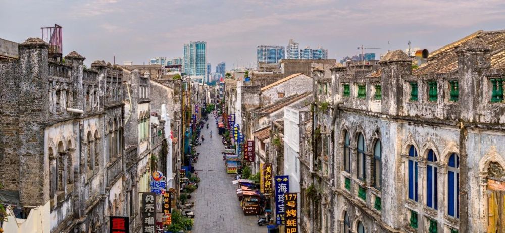 北海老街,位于珠海路及中山路區域,是一條始建于1821年的臨海街道。這條1.44公里長的老街兩旁,分布著英法德等國領事館舊址、德國森寶洋行舊址等許多中西合璧的騎樓式建筑。老街入口處豎著一門牌坊,門額上寫著“升平街”三個大字,這是老街最初的名字。