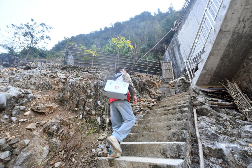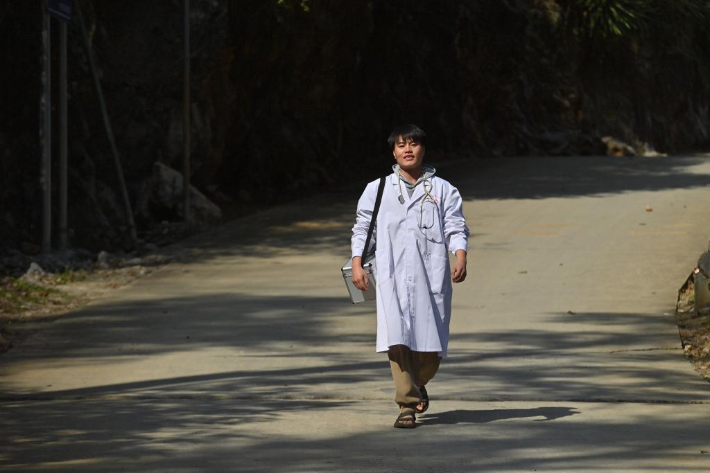在廣西大化瑤族自治縣板升鄉弄雷村,村醫蒙富松準備進村入戶給村民看?。?024年3月6日攝)。