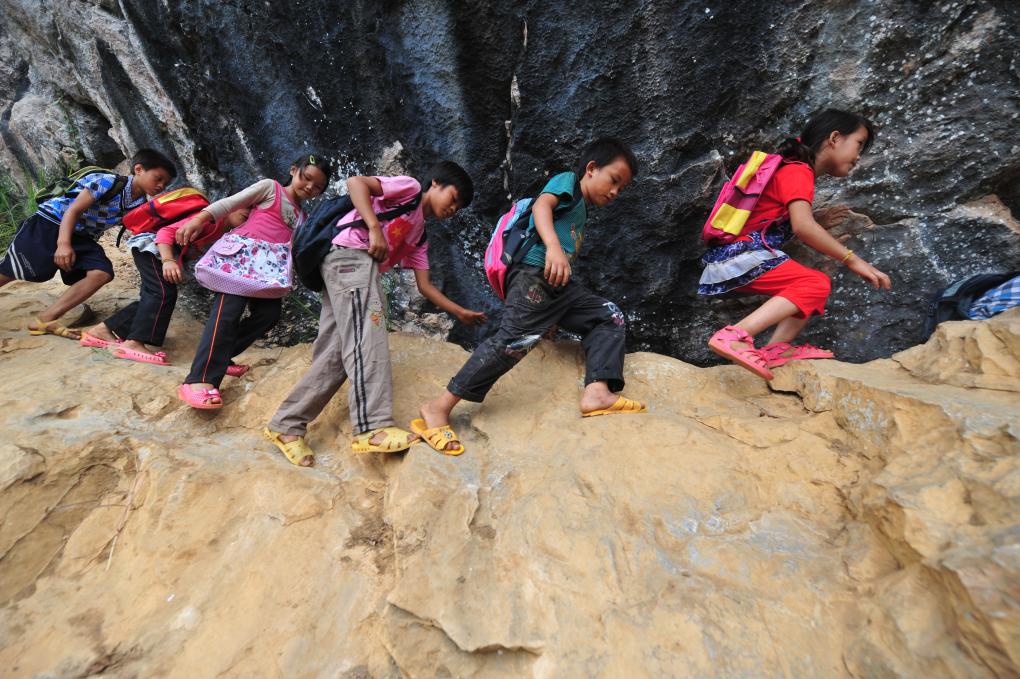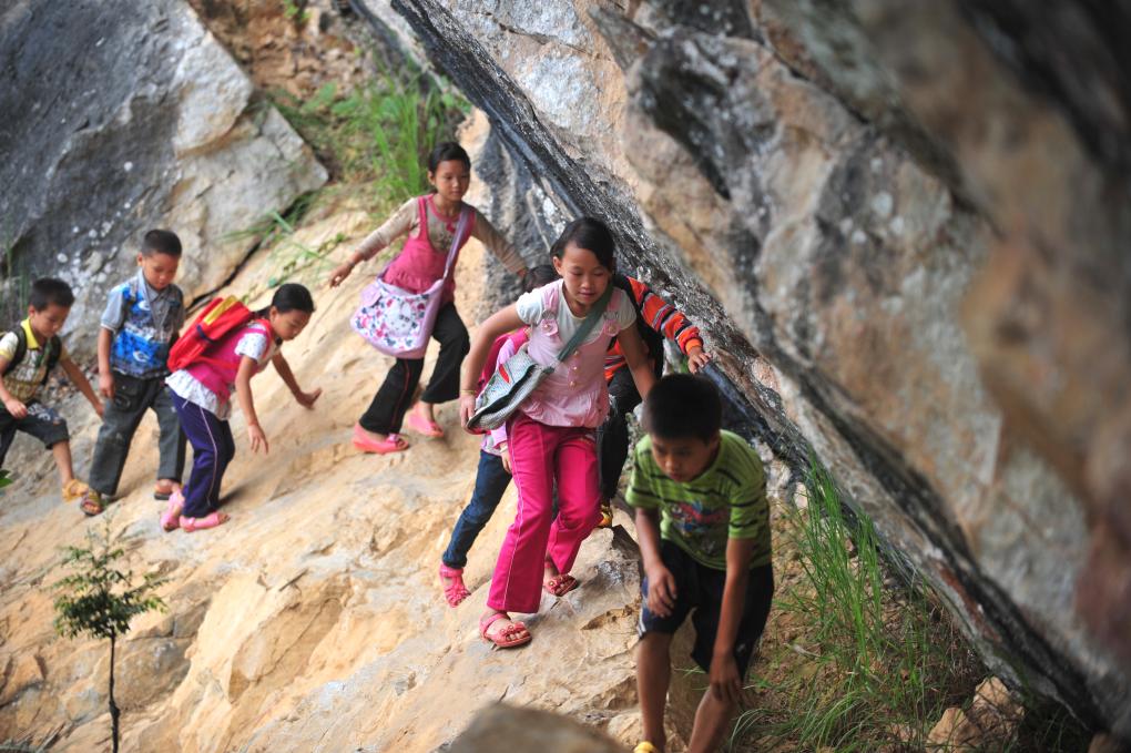 在廣西大化瑤族自治縣板升鄉弄雷村哈寶屯,10歲的蒙富松(左一)爬懸崖去學校讀書(2012年9月3日攝)。