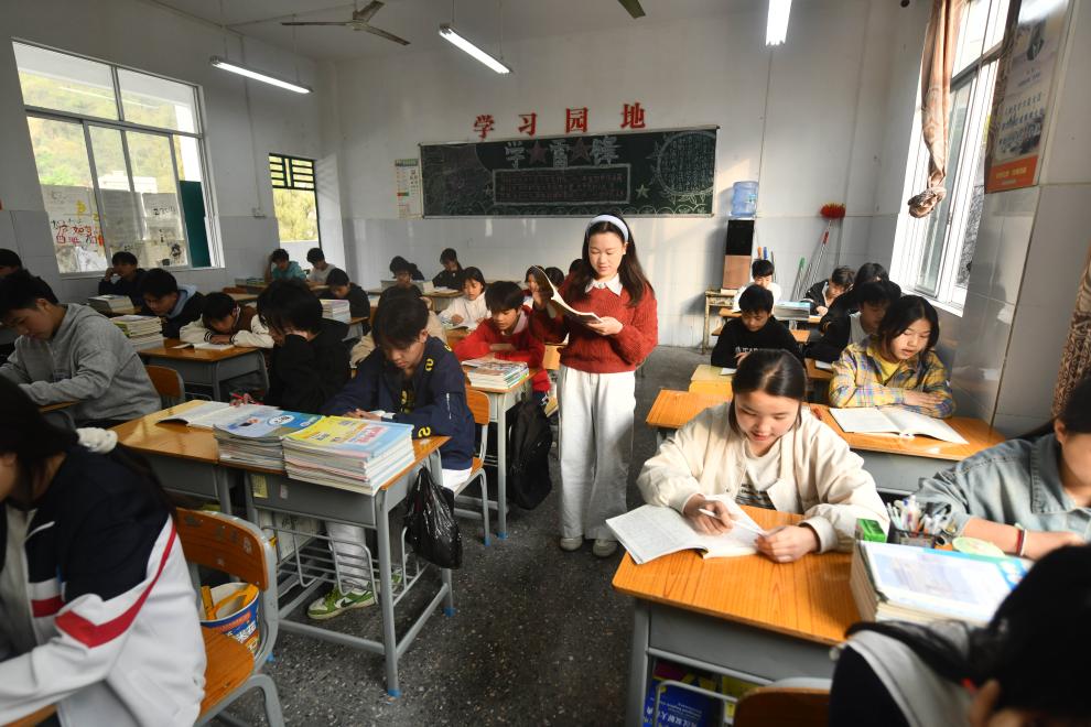 在廣西大化瑤族自治縣板升鄉初級中學,蒙秋艷給學生上課(2025年4月2日攝)。
