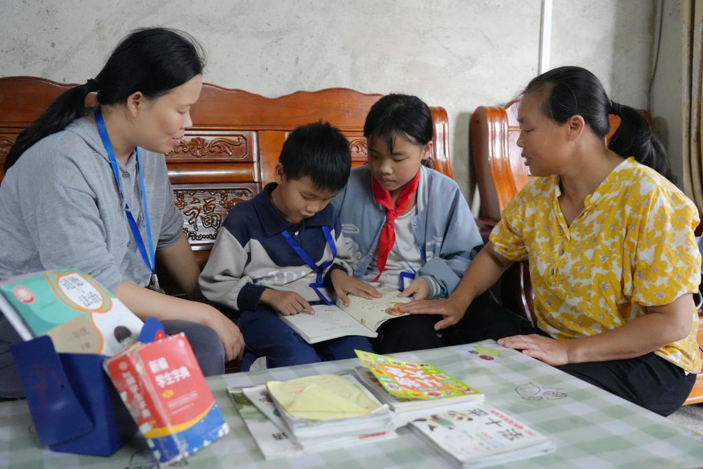 香花小學教師陳雪玲(左一)在學生蘇富榆(左二)家中家訪。新華社記者 張楓 攝