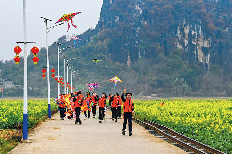 在廣西興業縣葵陽鎮一處農田,學生們在機耕路上放風箏(2025 年 2 月 19 日攝) 曹祎銘攝 / 本刊