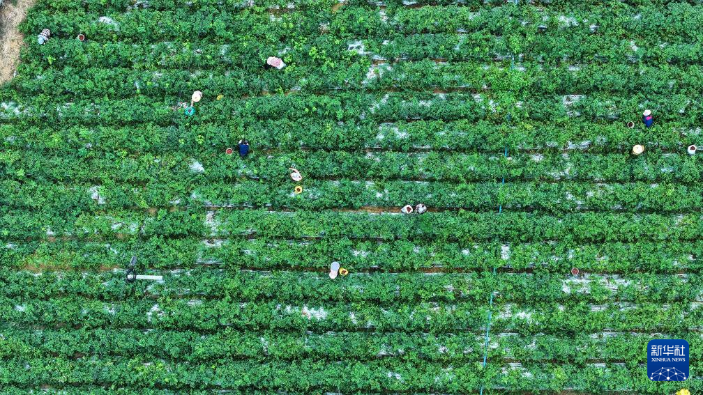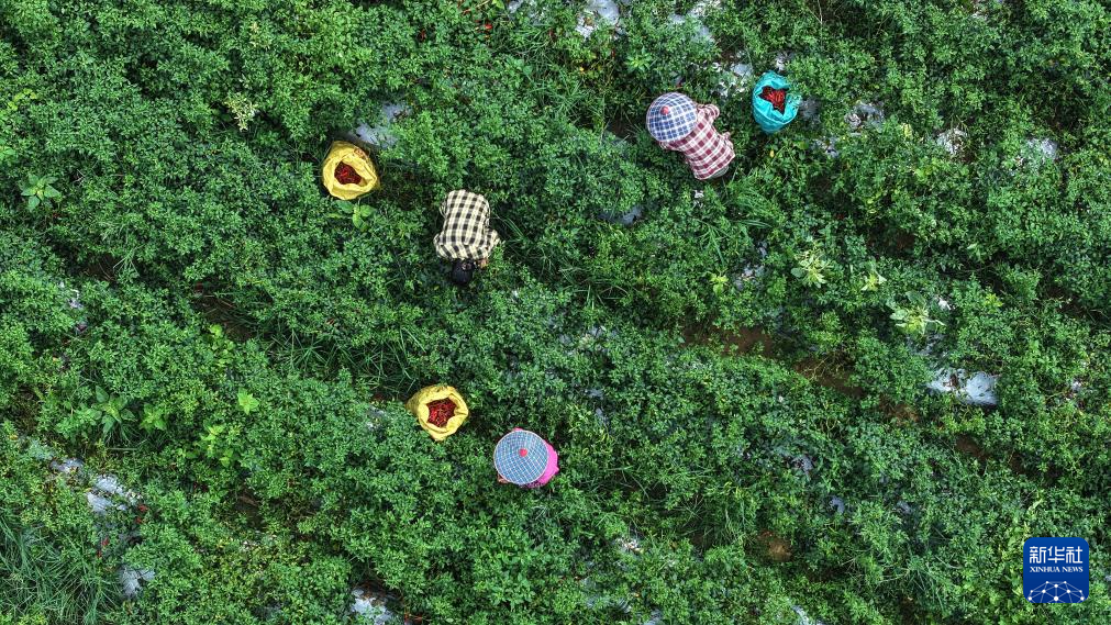 6月12日,欽州市欽南區沙埠鎮油埠村農民在收辣椒(無人機照片)。