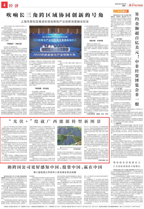 這樣的綠色轉型場景正在八桂大地不斷涌現。近年來,隨著“千家萬戶沐光行動”深入實施,“光伏+”深度融入廣西城鄉產業,南方電網廣西電網公司以電網平臺為支撐,推動構建“光伏+工業”“光伏+種植”“光伏+旅游”等多元發展格局。截至今年4月,廣西光伏裝機容量2405.9萬千瓦,同比增長78.4%,比2020年增長超十倍。