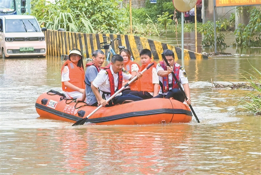 6月22日,受持續強降雨影響,河池市金城江城區發生內澇,當地干部群眾全力搶險保平安。圖為河池海事局救援人員在該城區老街村轉移被困群眾。陳林/攝