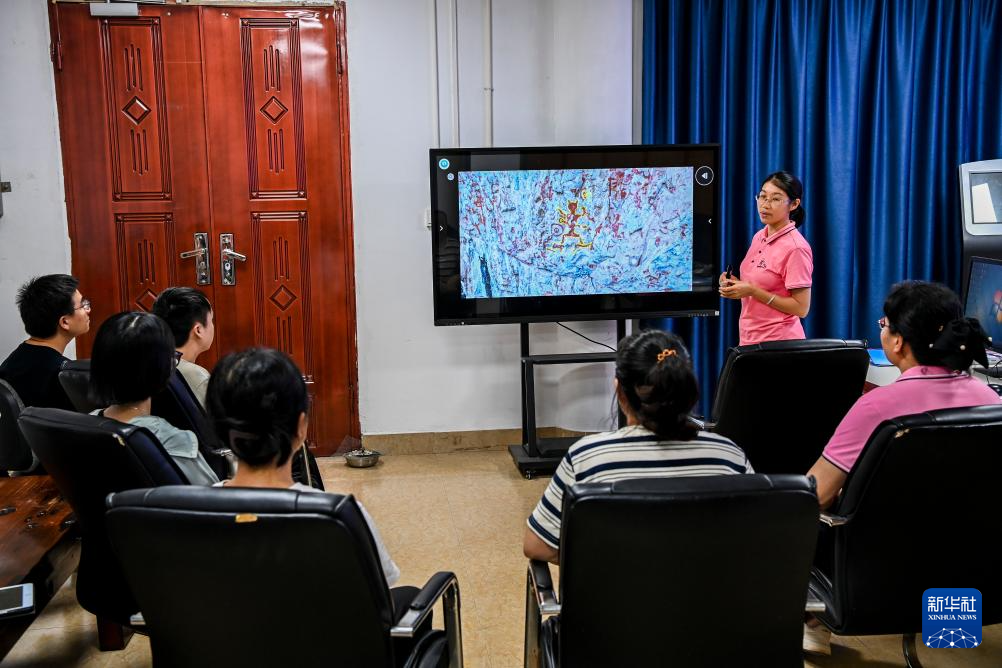6月19日,在位于廣西寧明縣的花山巖畫監測站,工作人員進行業務討論。