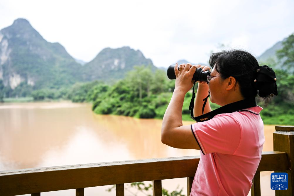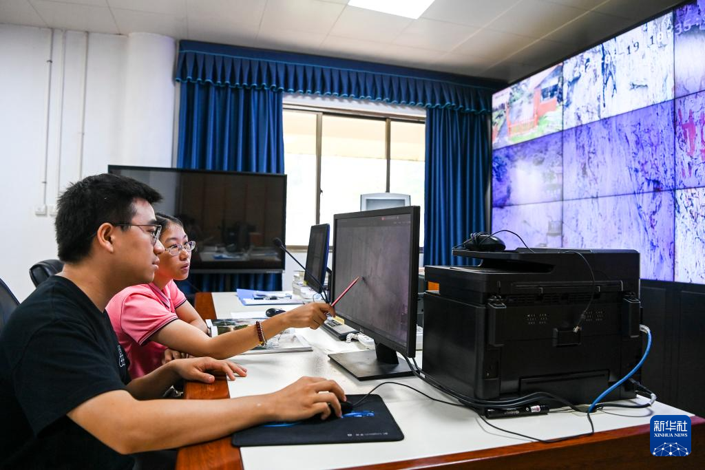 6月19日,在位于廣西寧明縣的花山巖畫監測站,工作人員通過監控設備查看巖畫情況。
