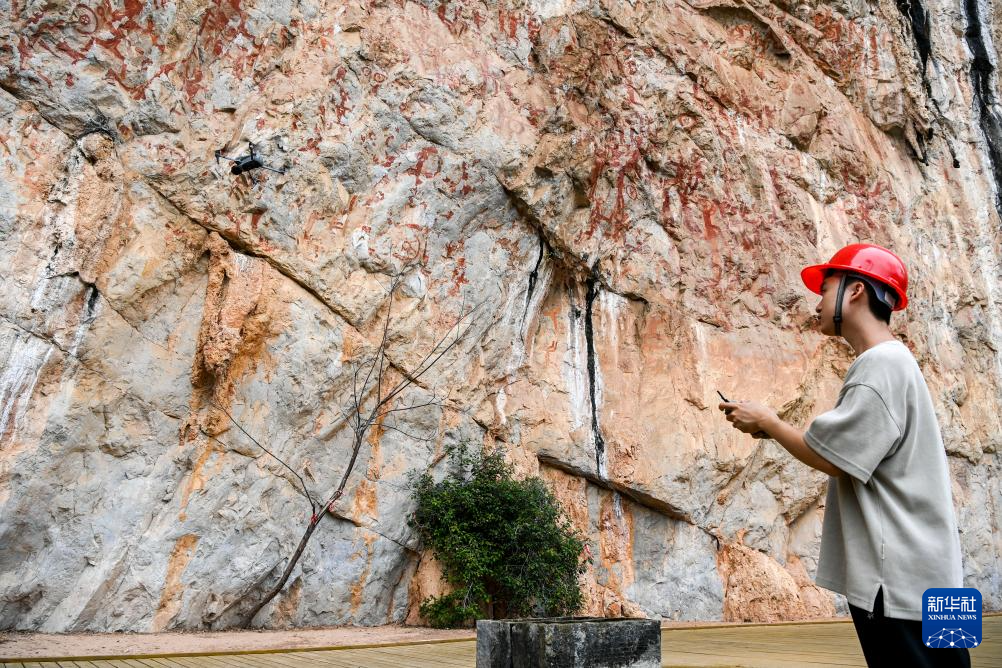 6月19日,在位于廣西寧明縣的一處花山巖畫,工作人員使用無人機對巖壁進行拍照。