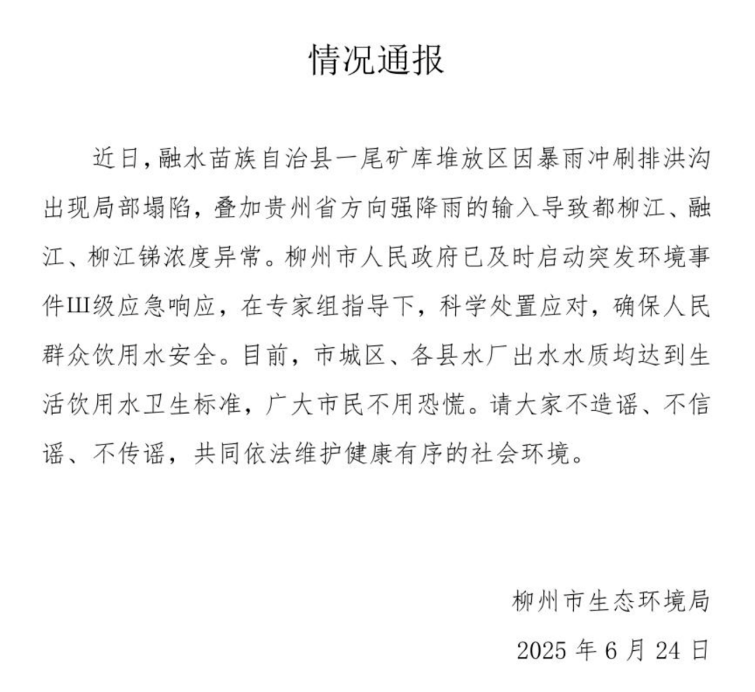 6月24日,柳州市生態環境局發布情況通報,詳情如下: