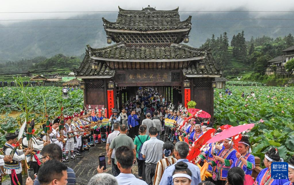6月28日,在廣西三江侗族自治縣良口鄉和里村的侗族文化長廊前,村民吹奏蘆笙歡迎游客。