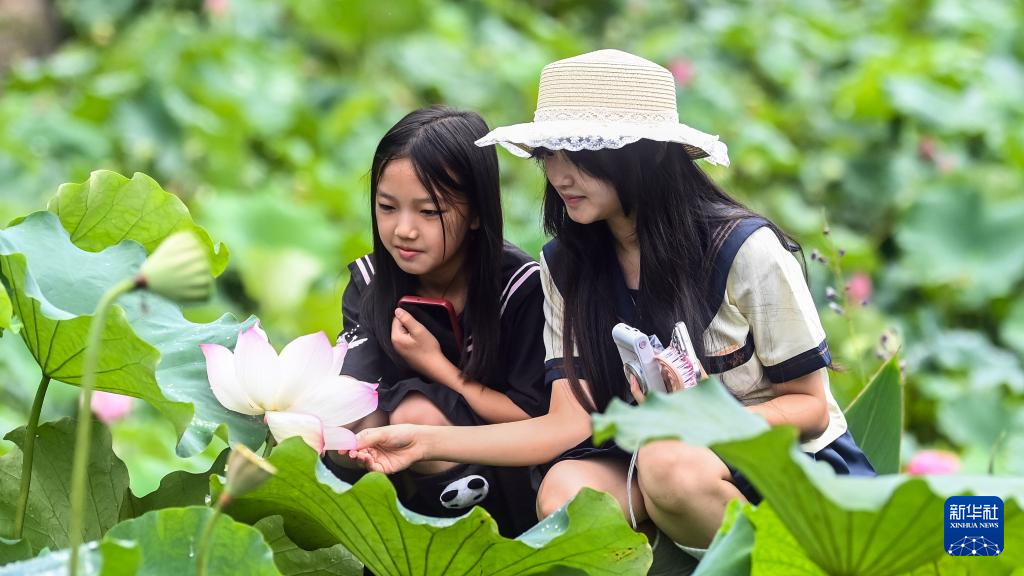 6月28日,在廣西三江侗族自治縣良口鄉和里村,游客觀賞荷花池的荷花。