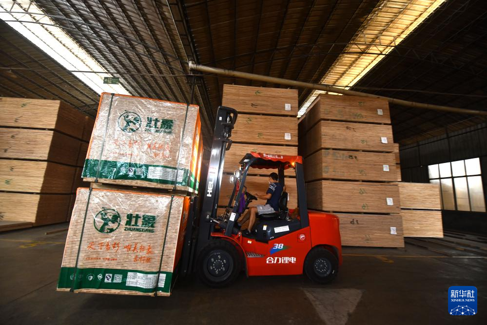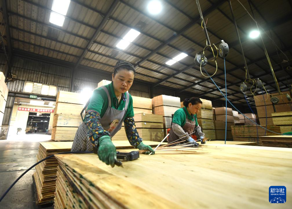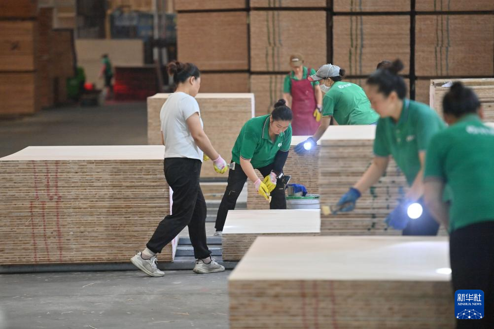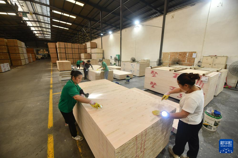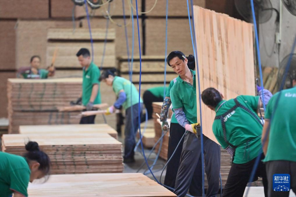 6月29日,工人在融安縣一家香杉生態板生產企業的生產線上作業。