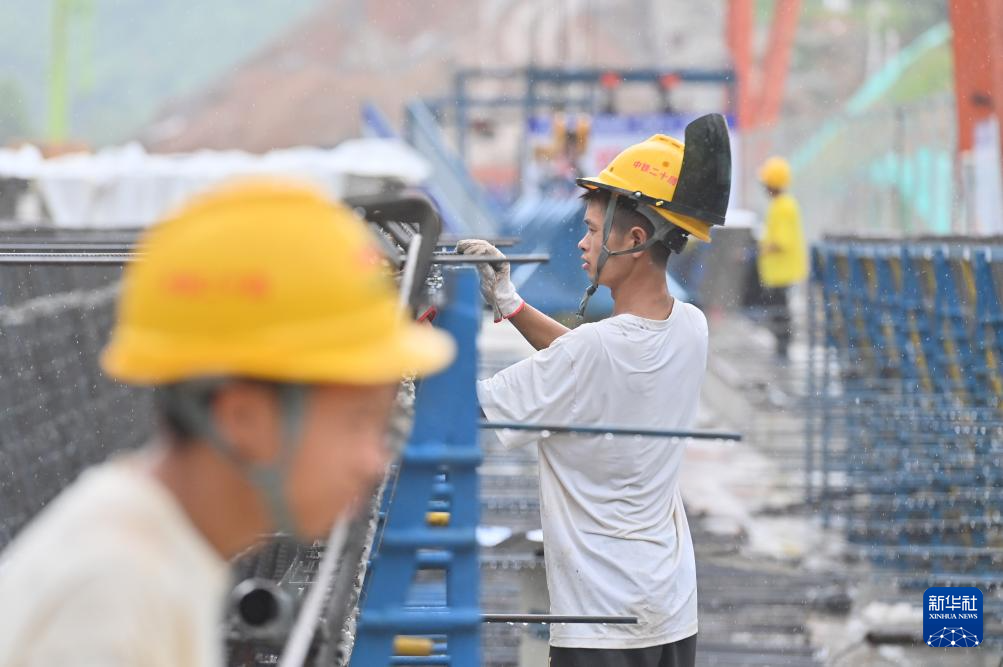 7月1日,中鐵二十局的工人在柳州市柳江區三都鎮魚宜高速公路建設工地作業。