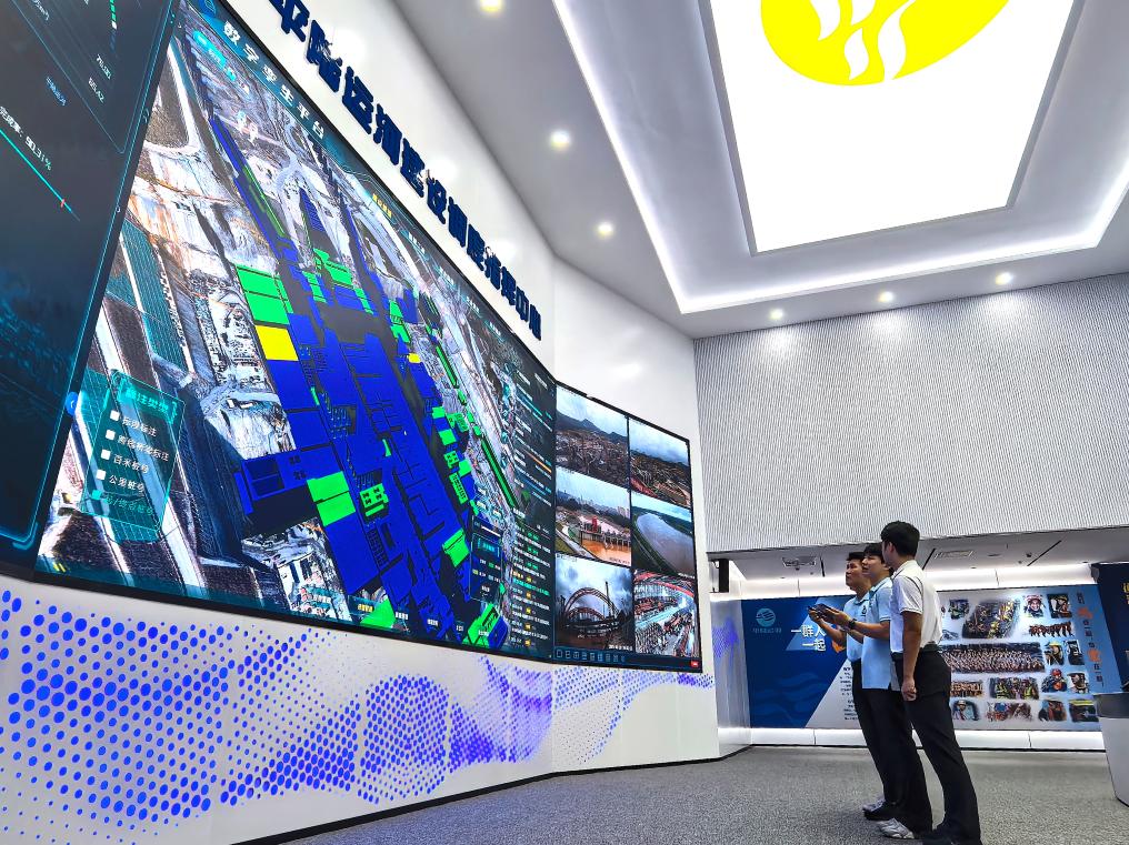 在廣西平陸運河建設指揮調度中心,工作人員正在查看數字孿生平臺。新華社記者 楊馳 攝
