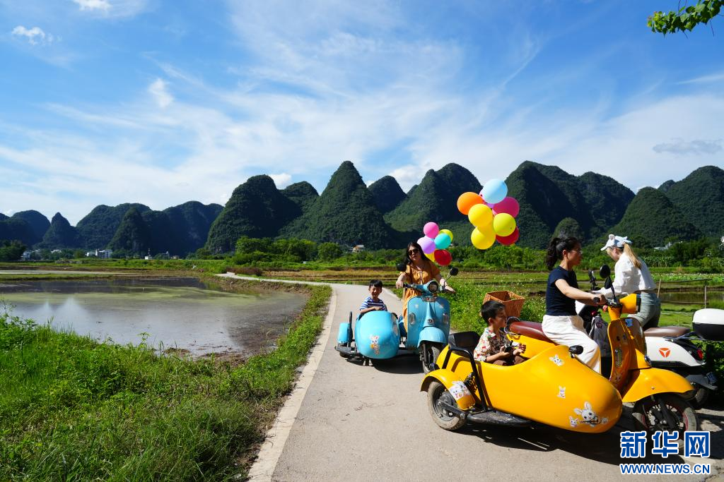 7月3日,在廣西桂林市陽朔縣,游客在騎摩托車游覽。新華社記者 張楓 攝