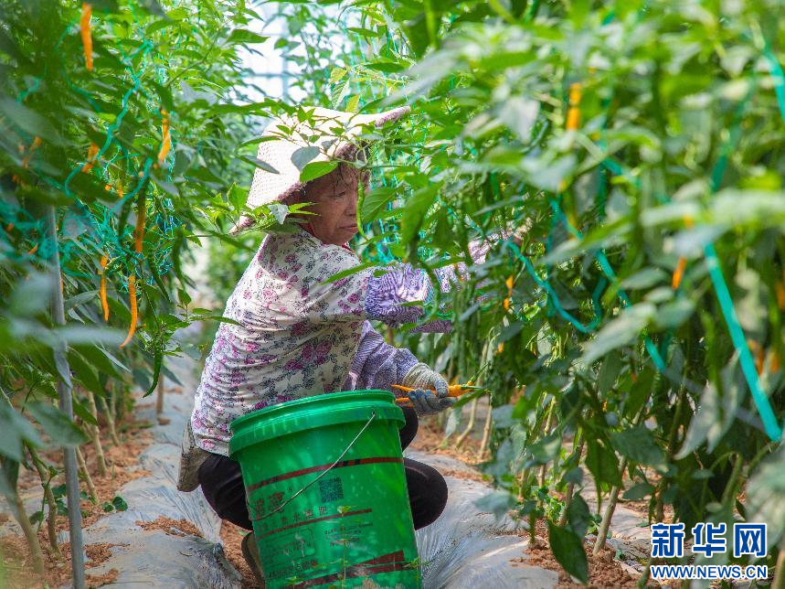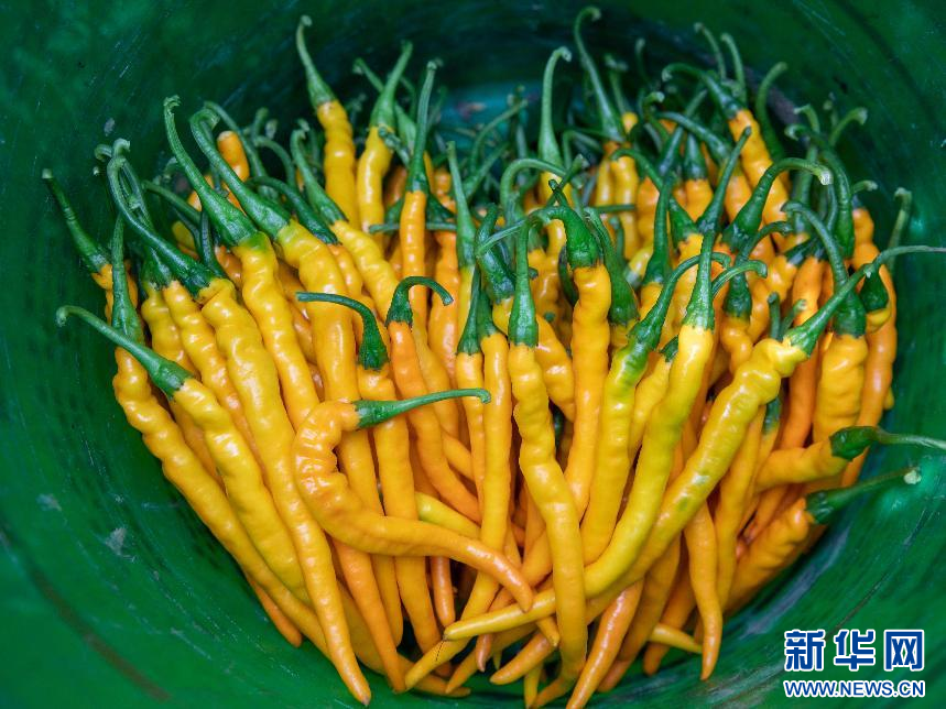 近日,在來賓市金秀瑤族自治縣桐木鎮新三智慧農業產業基地內,工人采摘成熟的辣椒。唐輝 攝