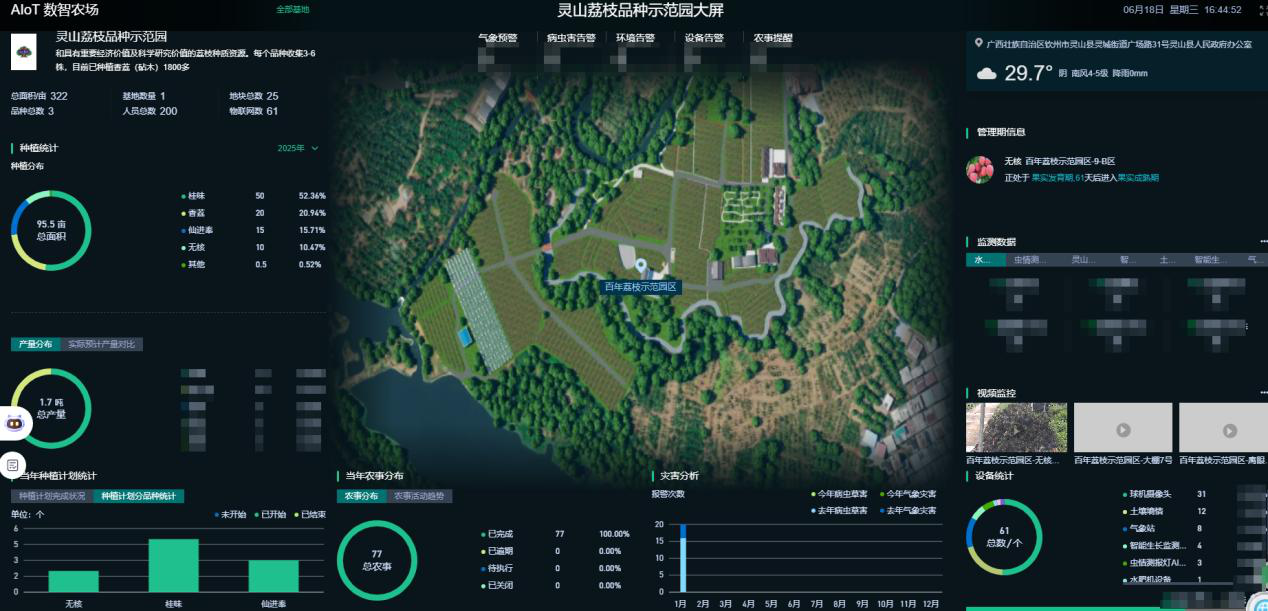 靈山電信因地制宜,將荔枝基地納入智慧農業整體布局,打造1:1數字孿生果園。依托部署在果園內的莖流儀、環境監測站、果實傳感器等物聯網終端,將果樹的“喝水”速度、“長個”進程及光照、濕度等環境參數實時采集并同步上傳。通過5G網絡回傳,果農足不出戶便可通過大棚智能控制系統實時查看果園“健康狀態”,實現精準施肥、智能灌溉,助力傳統農業向數字化轉型。