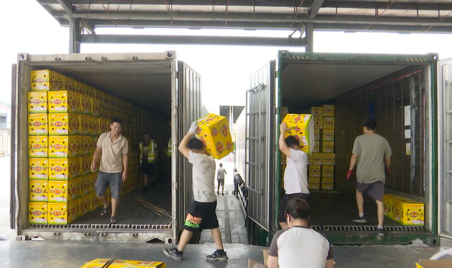 通過海關查驗后,東盟新鮮水果進入中國市場流通的“第一站”——中國—東盟(崇左)水果交易中心。在貨物過駁平臺上,工人們將火龍果從貨車卸下,轉運至國內運輸車輛,發往各地。作為廣西三大水果交易中心之一,該中心核心區已建成投入使用,具備產品集散、線上線下交易等五大功能,日均交易量大且快速提升。