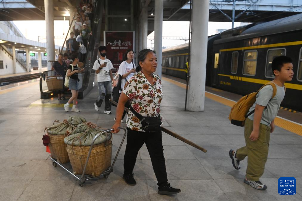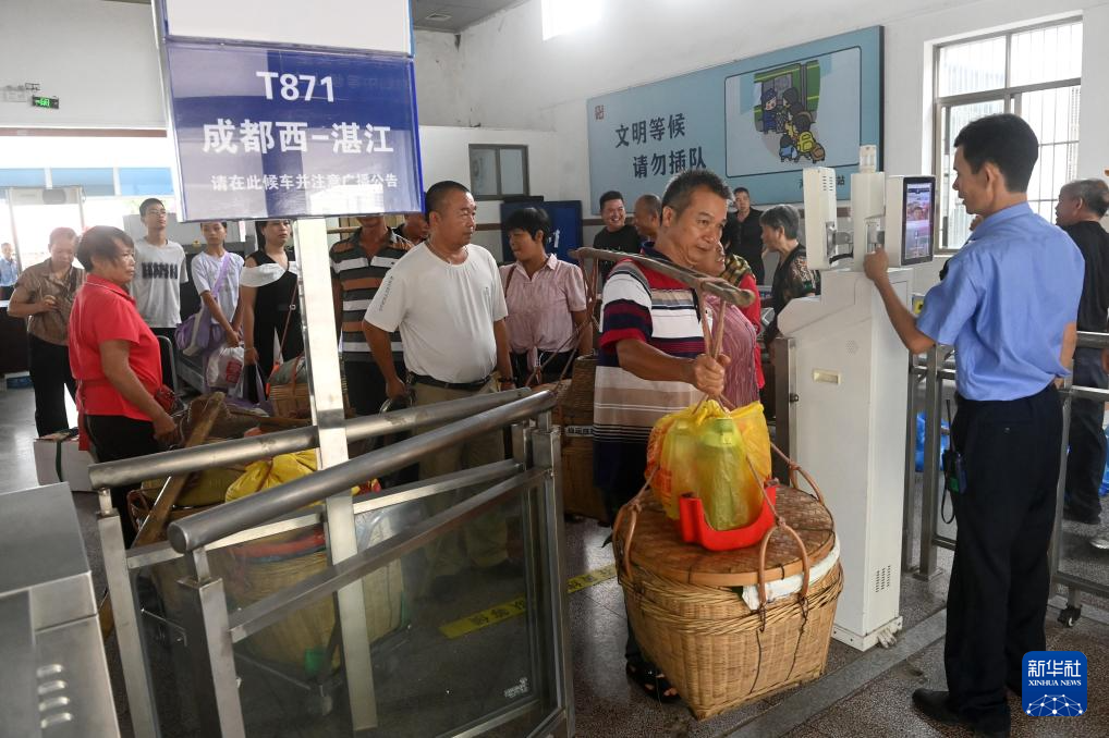 7月9日,在黎湛鐵路玉林站,一名賣完水果的果農(前左一)準備乘坐火車回家。