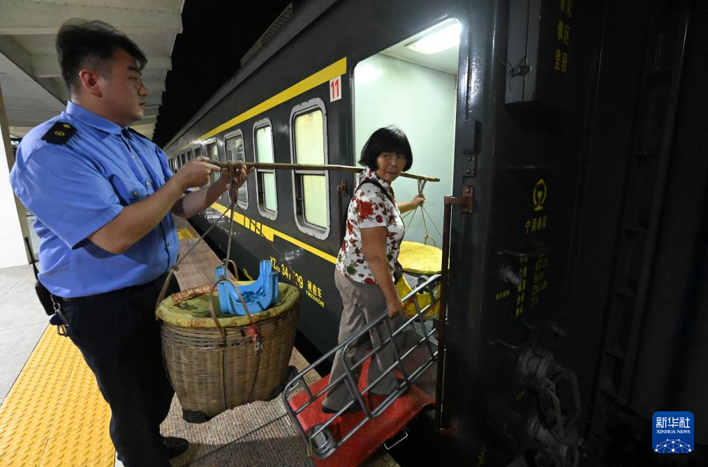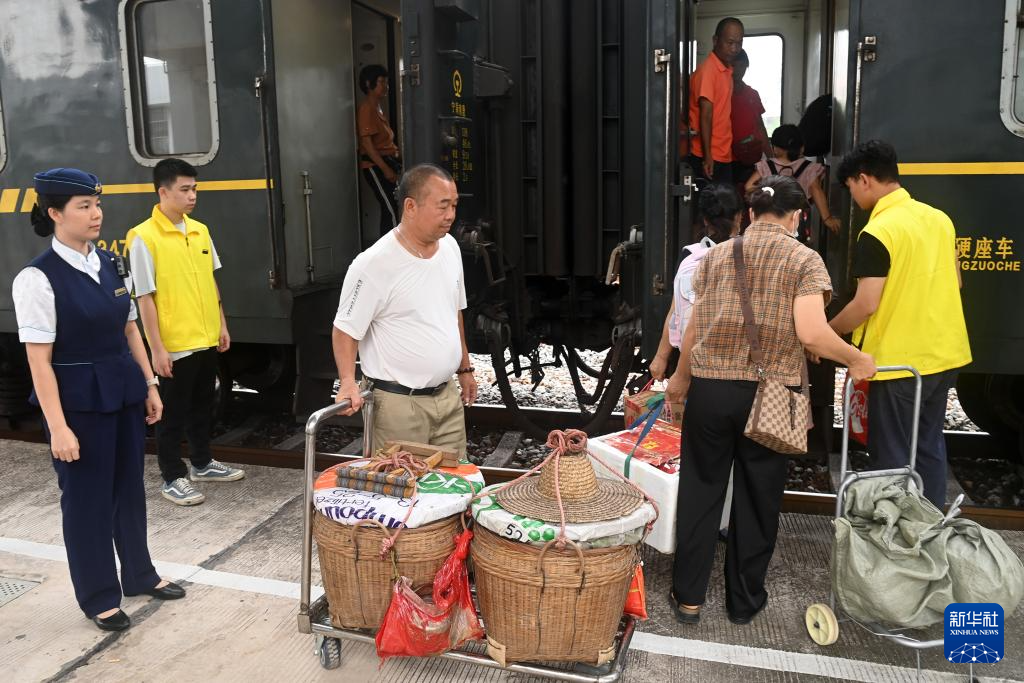 黎湛鐵路線上的綠皮客運列車票價實惠,??寇囌径?。多年來,鐵路部門在車站設置了專門候車區,鐵路工作人員常為挑重擔的果農搭把手、幫個忙,為果農售賣水果提供便利。