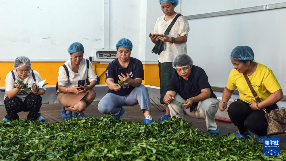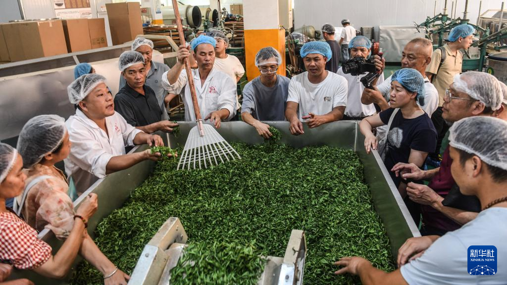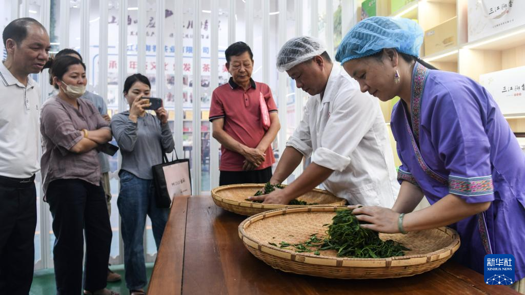 7月11日,制茶匠人在廣西三江縣御香茶業有限公司生產車間學習比對茶葉“殺青”技藝。
