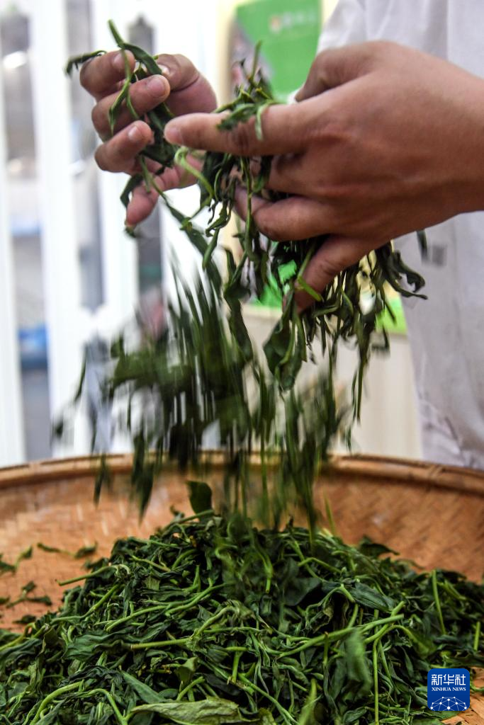 7月11日,制茶匠人在廣西三江縣御香茶業有限公司生產車間演示茶葉“揉捻”技藝。