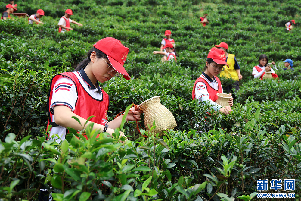 學生在梧州市蒼梧縣茶山體驗采摘茶葉。鄒雨成 攝