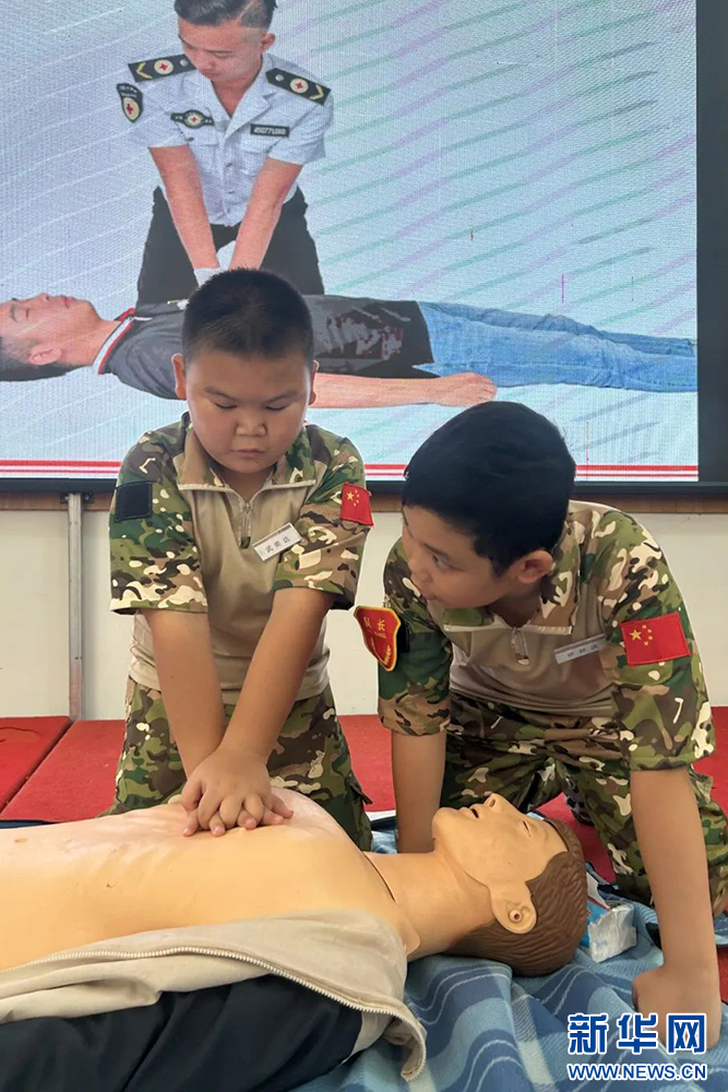 在南寧市良慶區大王灘營地夏令營,學生在學習心肺復蘇急救法。
