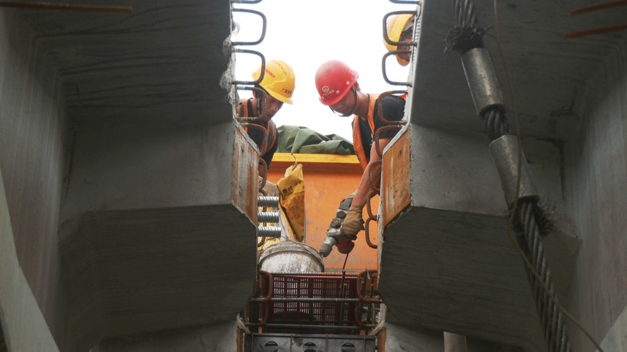 近日,柳梧鐵路4標項目金田紫荊河特大橋段現場機器轟鳴,工人們正在緊張有序地進行最后一片T梁的架設工作。隨著最后一片32米T梁落位,柳梧鐵路4標項目T梁架設任務完成,為后續橋面附屬、橋面防水施工奠定了堅實基礎。