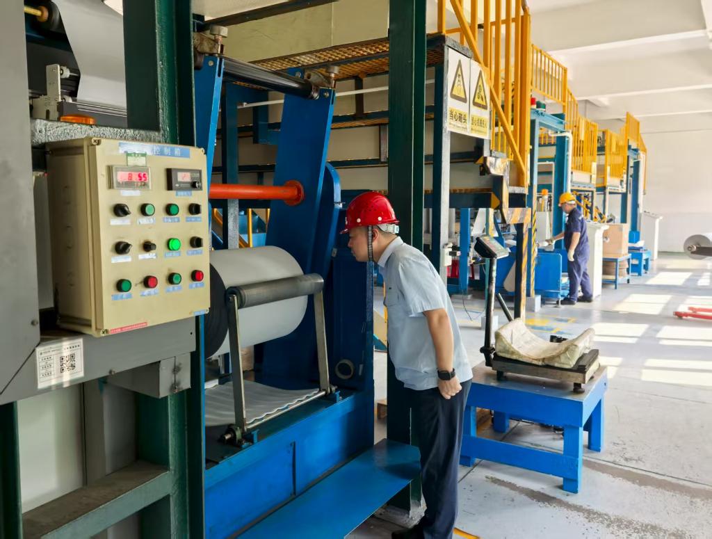 走進廣西賀州市桂東電子科技有限責任公司電極箔生產車間,公司副總經理梁力勃正在生產一線查看電極箔成品,不時調整生產參數。