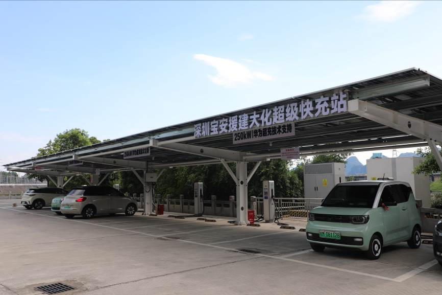 這座超充站是國家“百縣千站萬樁”試點工程的重要項目,也是粵桂協作助力鄉村振興的標桿工程。項目投入粵桂協作資金200萬元,采用了華為的全液冷超充技術,集成了光伏發電、儲能系統及超快充電功能,是河池市首個新能源充電示范站。站內配備了1套華為全液冷超充主機、12個快慢充結合的充電樁及相關設施,有效解決了大化鎮古江社區(安置區)及周邊區域新能源車主的充電難題。