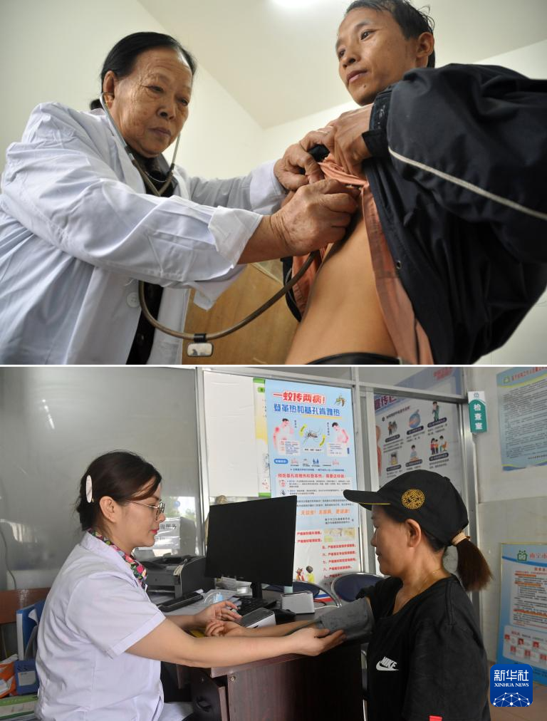 這是一張拼版照片。上圖:杜桂梅醫生(左)在高嶺村衛生室為村民檢查身體(2011年12月7日攝)。下圖:潘雪梅醫生(左)在高嶺村衛生室給村民測量血壓(2025年8月18日攝)。