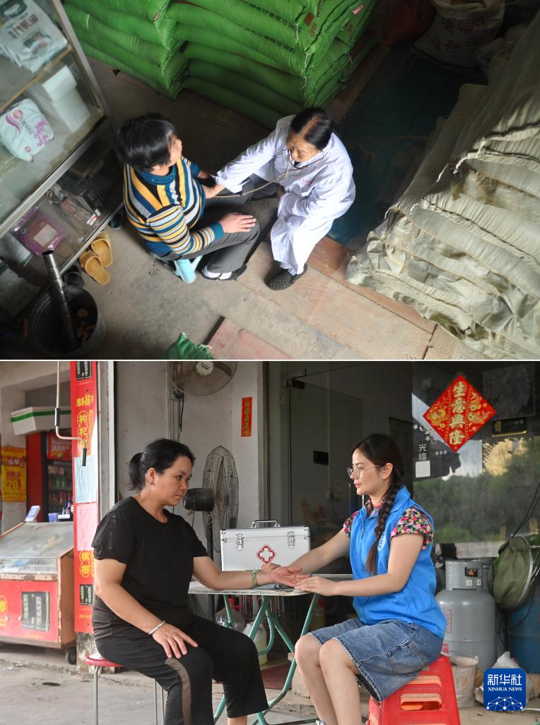 這是一張拼版照片。上圖:在廣西南寧市高嶺村,杜桂梅醫生(右)入戶為村民檢查身體(2011年12月7日攝)。下圖:潘雪梅醫生(右)入戶為村民檢查身體(2025年8月18日攝)。