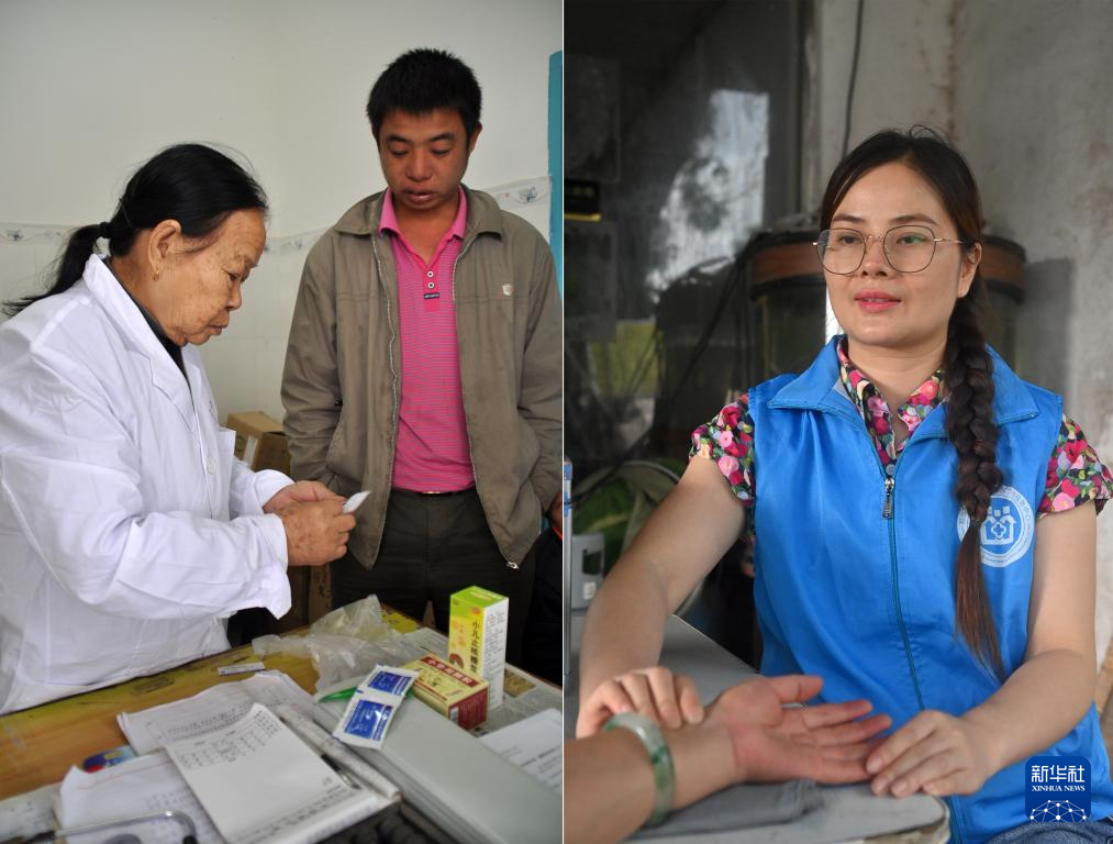 這是一張拼版照片。左圖:在高嶺村衛生室,杜桂梅醫生向村民交代用藥注意事項(2011年12月7日攝)。右圖:潘雪梅醫生入戶為村民把脈看?。?025年8月18日攝)。