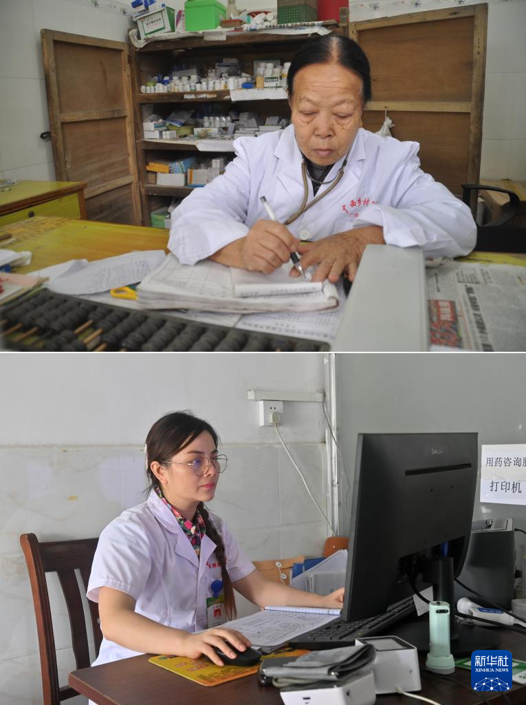 這是一張拼版照片。上圖:杜桂梅醫生在高嶺村衛生室為病人手寫處方(2011年12月7日攝)。下圖:潘雪梅醫生在高嶺村衛生室用電腦錄入病人信息(2025年8月18日攝)。