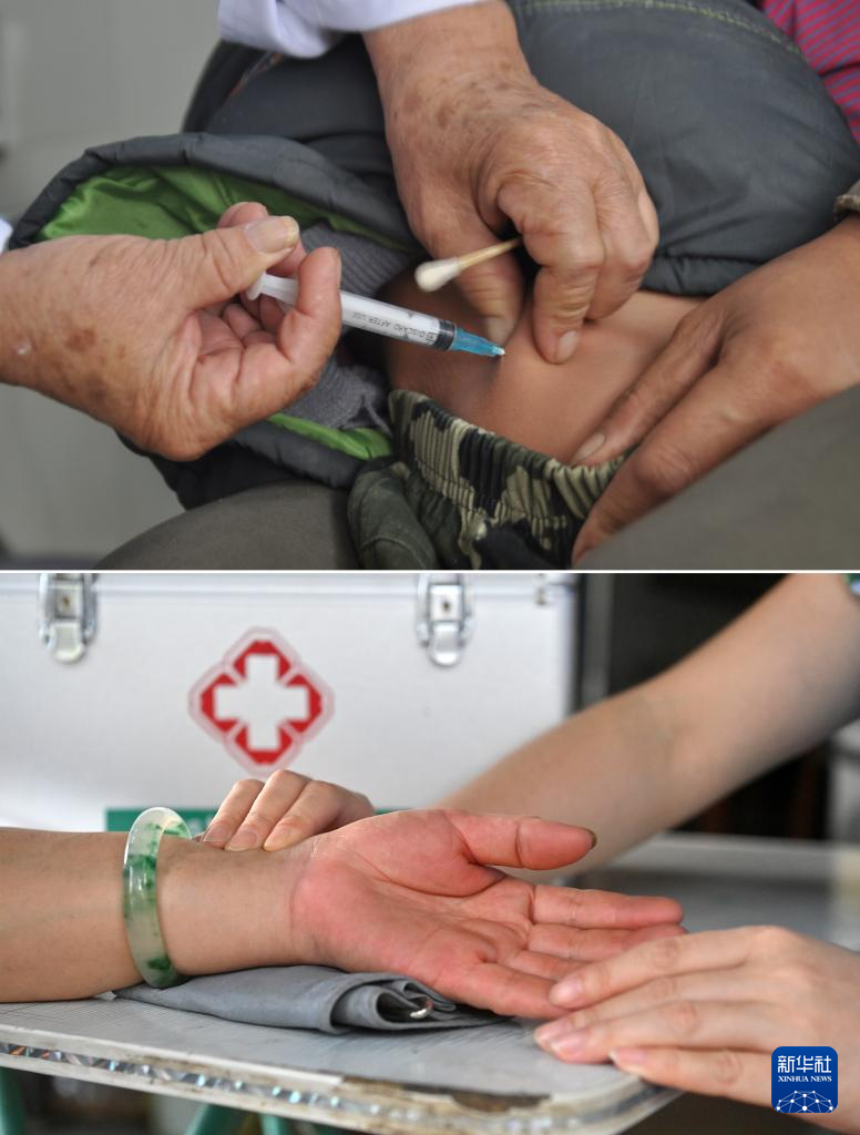 這是一張拼版照片。上圖:杜桂梅醫生在高嶺村衛生室給村民打針(2011年12月7日攝)。下圖:潘雪梅醫生在高嶺村衛生室為村民把脈看?。?025年8月18日攝)。