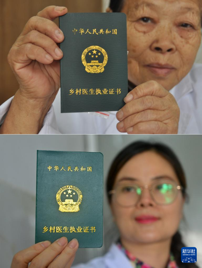 這是一張拼版照片。上圖:杜桂梅醫生在高嶺村衛生室展示自己的鄉村醫生執業證書(2011年12月7日攝)。下圖:潘雪梅醫生在高嶺村衛生室展示自己的鄉村醫生執業證書(2025年8月18日攝)。