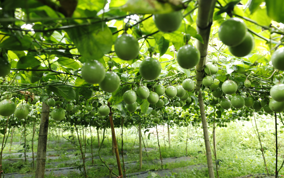 猴背村百香果園中掛滿了果子。