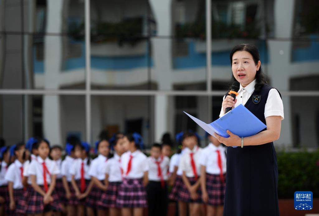 9月1日,在廣西南寧市濱湖路小學,學校黨委書記謝小燕為新學期開學致辭。新華社記者 陸波岸 攝