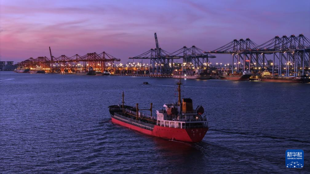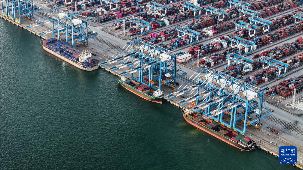 9月4日,海輪??繗J州港集裝箱自動化碼頭裝卸集裝箱(無人機照片)。